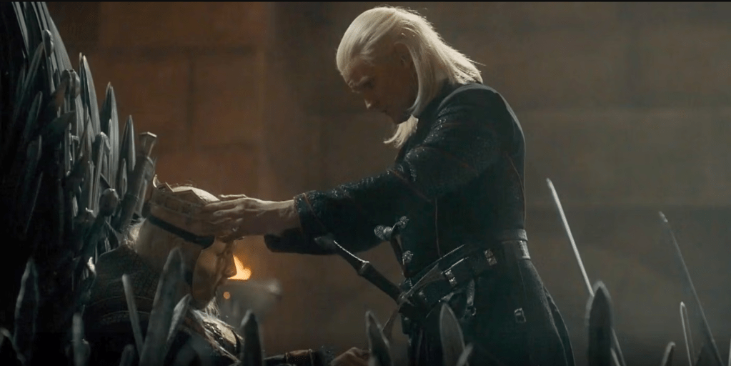 - Viserys entering the throne room was him as publicly as possible saying that Rhaenyra was his true heir. This was fully an act of support. He also allowed Daemon, not the guard, to assist him, showing that after all this time the brothers were on good terms. Fun fact, his crown falling off was an accident, and Matt Smith placed it back on his head while filming. The crew loved this moment so much that they wrote it in, and scrapped a later scene where Daemon makes a toast, as they found this wordless exchange far more powerful.